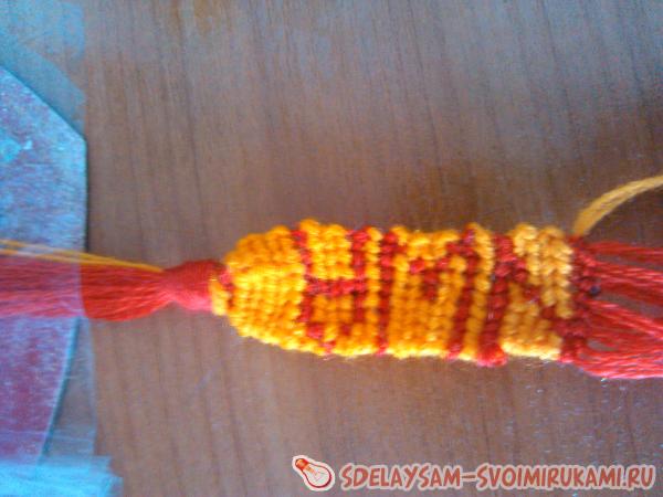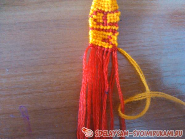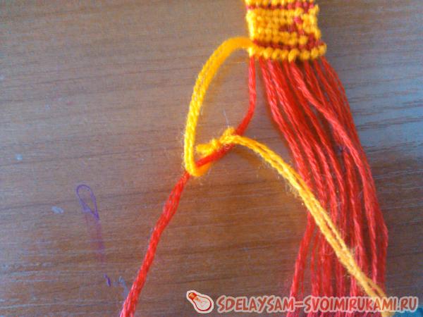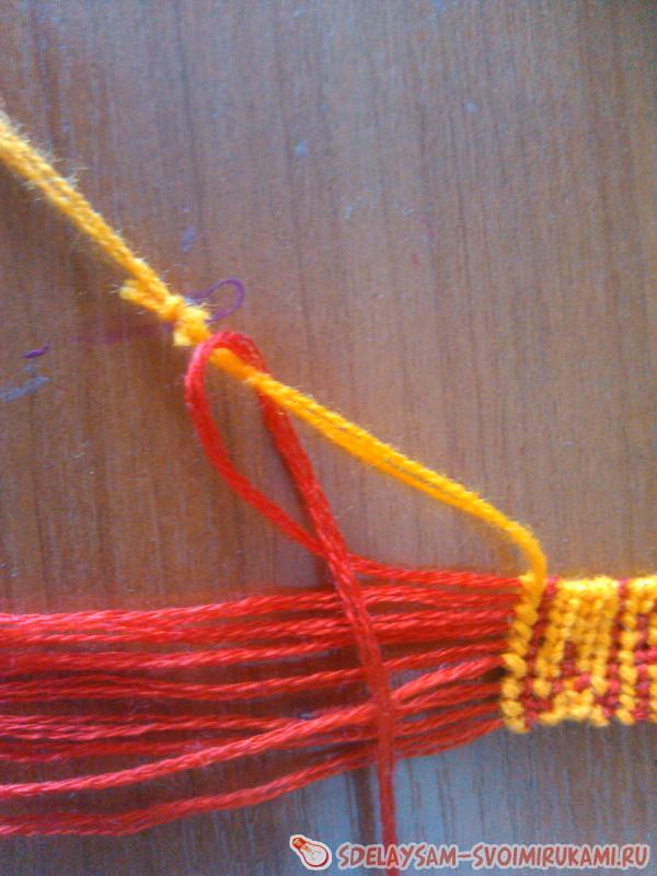 Начинаем плетение. Первый ряд будет полностью желтым, под цвет фона. В правую руку берем желтую нитку и завязываем узелком ее на первую красную нитку, затягиваем.
