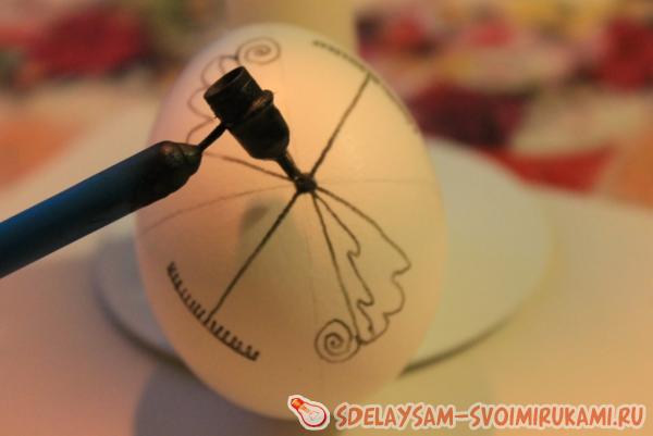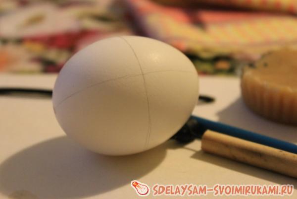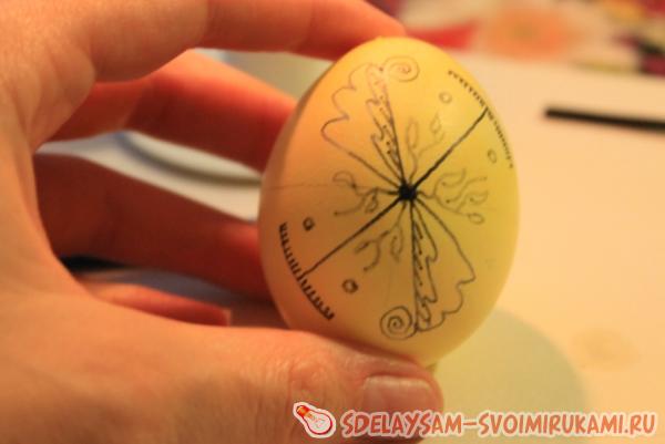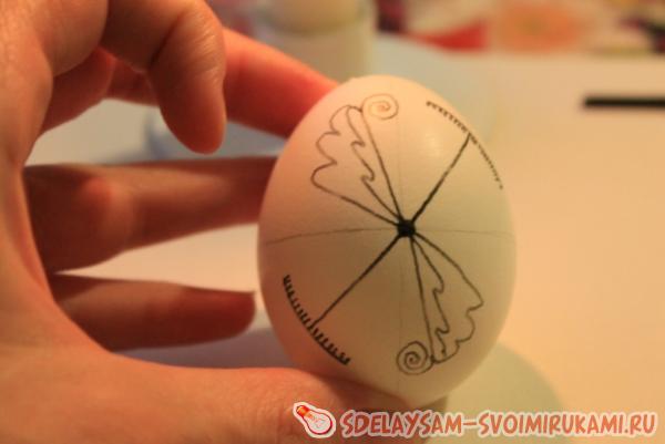 Итак, берем одно яйцо и с помощью карандаша наносим на него основные линии, по которым будем затем ориентироваться при нанесении узора. Количество и расположение этих линий зависит от рисунка, но для этой писанки нам нужно всего лишь поделить на четыре части переднюю и заднюю часть яйца.