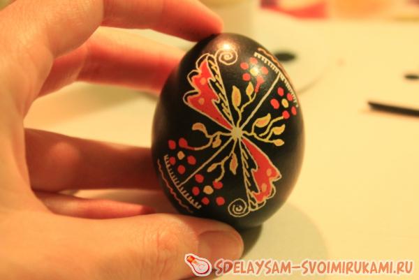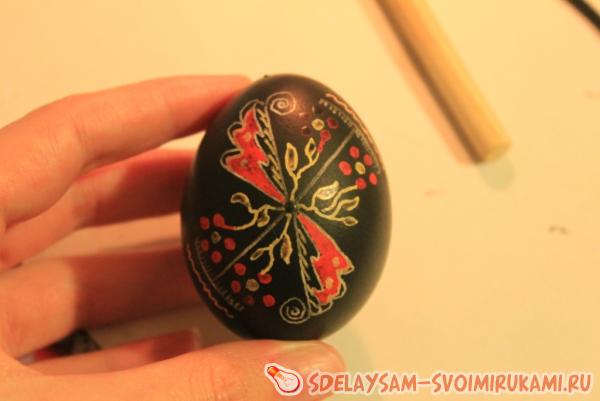 Делаем последние штрихи воском: дорисовываем точечки-лепестки цветов и заполняем воском элементы «крыльев», после чего окрашиваем писанку в финальный черный цвет.