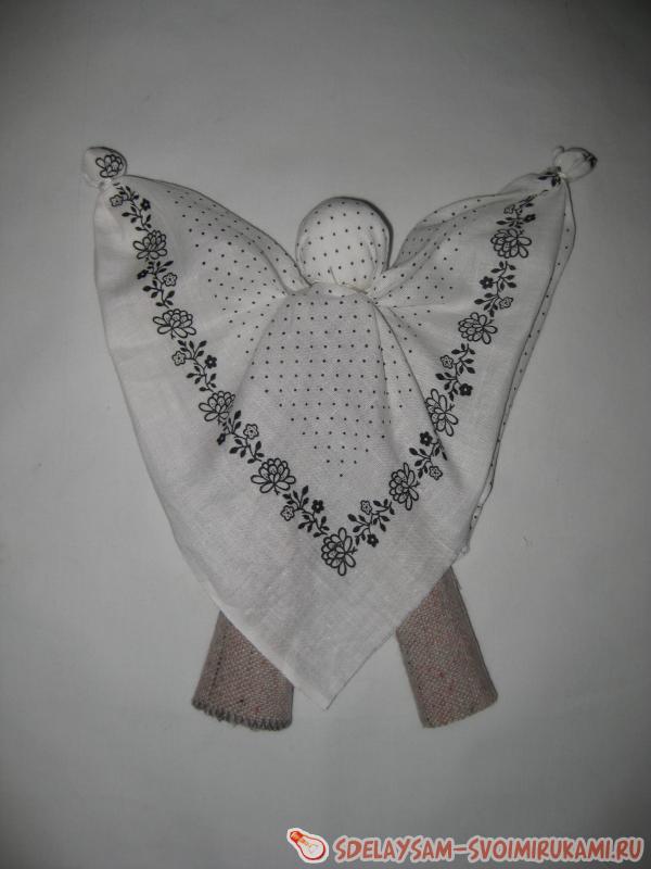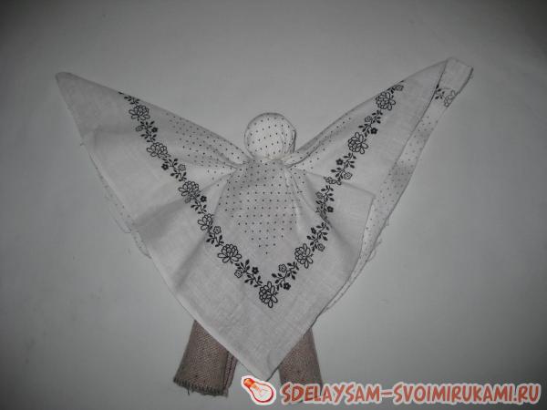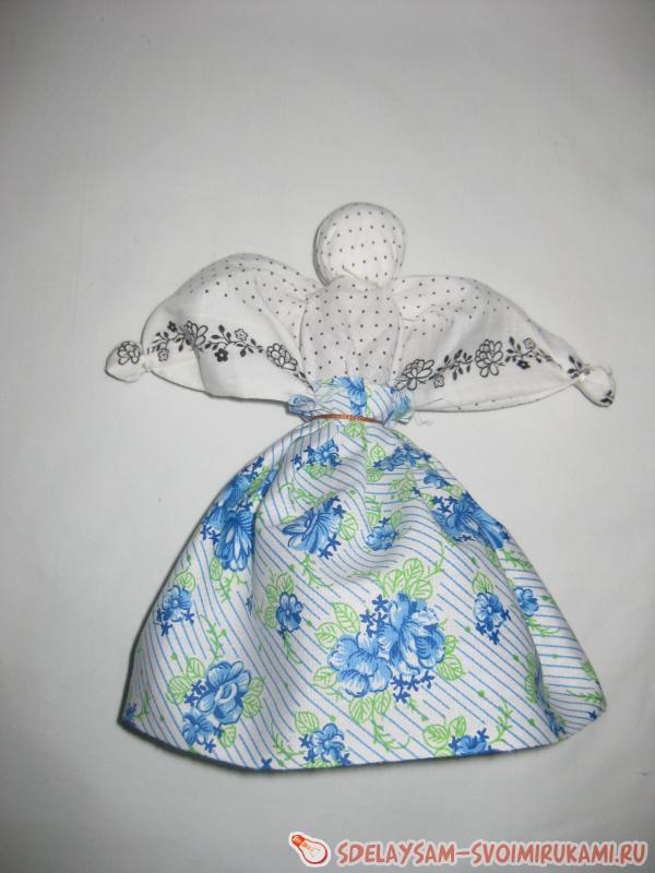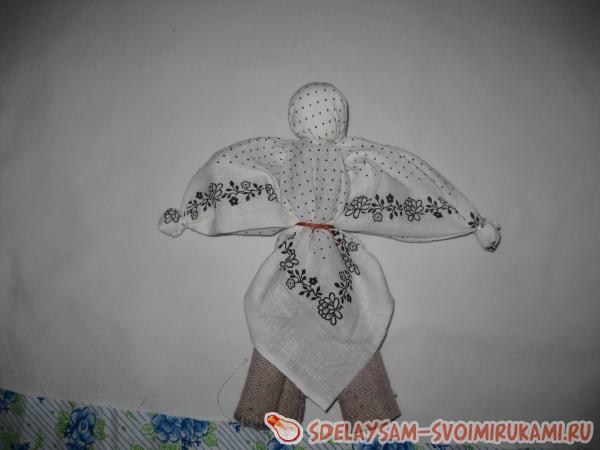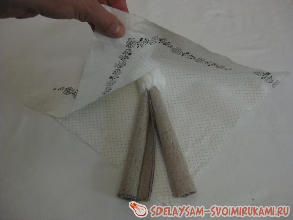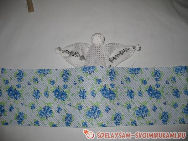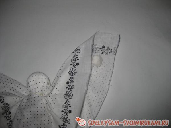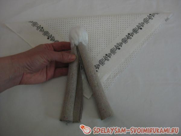 6.На свободных концах косынки закладываем маленькие ватные шарики, руки куклы.