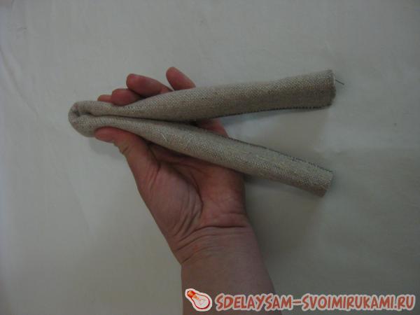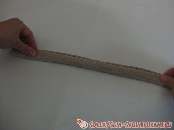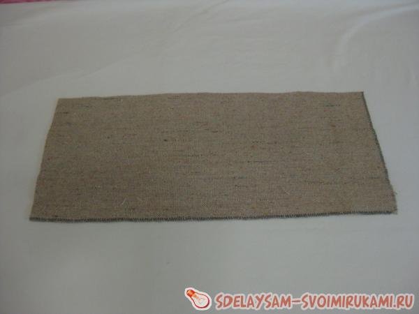 1. Возьмём небольшой лоскут плотной ткани прямоугольной формы, грубой фактуры, так как она должна хорошо держать форму (рис. 2). Скатаем его в рулон.