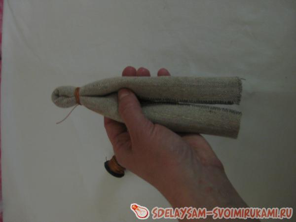 5. В косынку вложим заготовку. Соединим голову, туловище и треугольник. Снова укрепим шею нитками, наматывая против часовой стрелки.