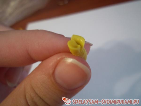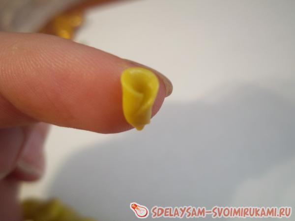 Далее, раскатываем точно такой же круг или овал, и прикрепляем ее к нашей сердцевине, которую мы уже сделали. Чтобы лепесток получился натуральнее, иголочкой чуть-чуть «подворачиваем» края. Должно получиться примерно вот так: