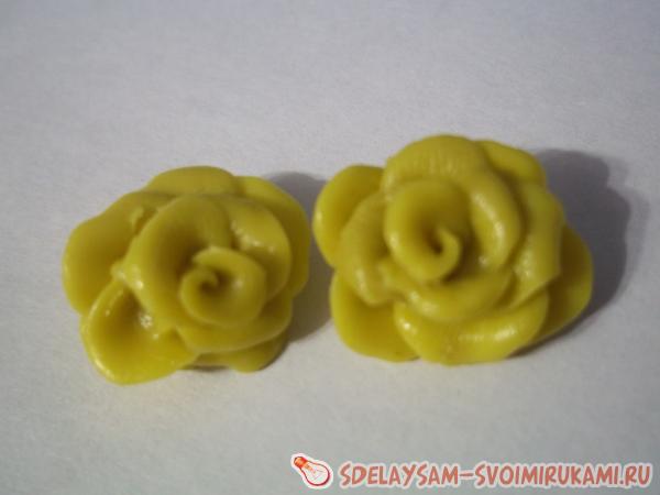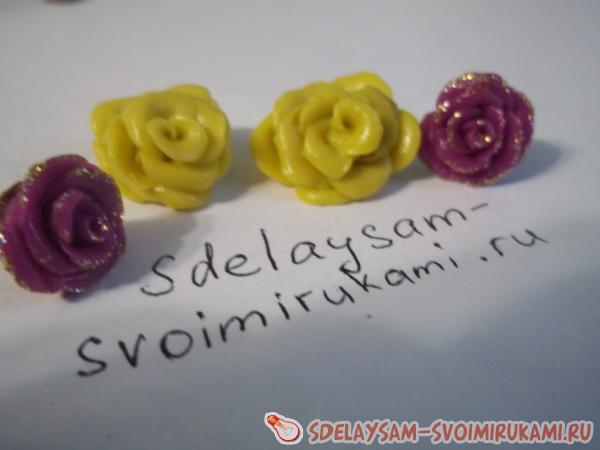 После того, как серьги будут готовы, дайте им остыть. Позже склейте цветки и фурнитуру так, как написано в инструкции по применению купленного вами клея. После того, как клей застынет, нанесите на серьги лак, это увеличит срок службы украшений из пластики.