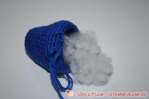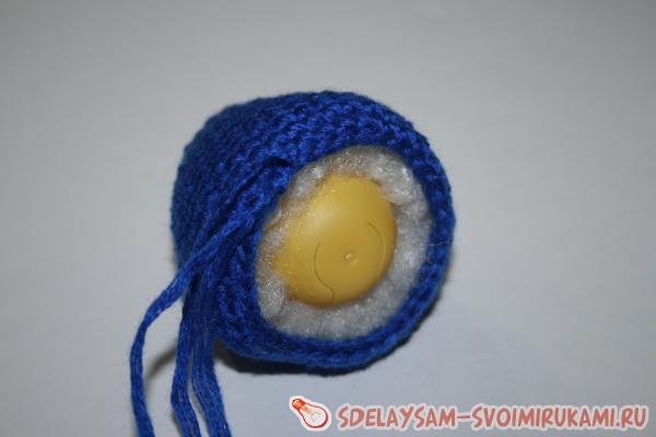 После третьего ряда без прибавок начните добавлять в каждый ряд по три дополнительных столбика, равномерно распределяя их по ряду. Свяжите так 4-5 рядов, затем снова 2-3 ряда вяжите без прибавок. В следующие 2 ряда равномерно добавьте по 4 добавочных столбика. Далее провяжите 3-4 ряда без добавок и начинаем сужать. Убавляем сначала по 4 петли с ряда. Провязав два столбика можно вставлять контейнер от киндера с бисером внутри. Для этого сначала в верхнюю часть засуньте немного синтепуха, чтобы голова птичка была мягкой.