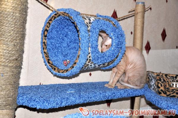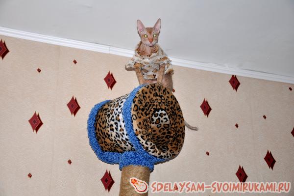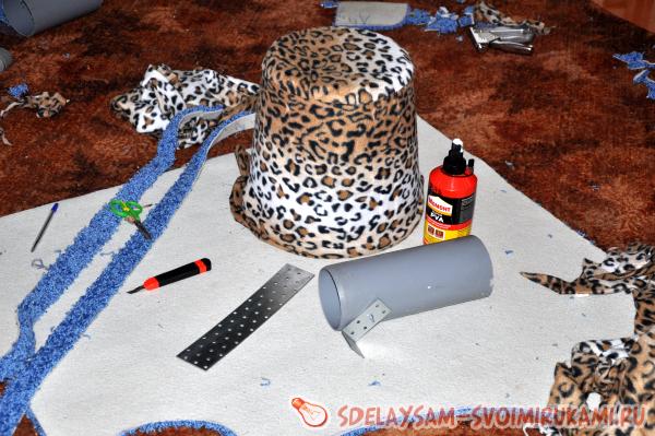 Рассмотрим пример создания такого комплекса. Задумывался комплекс для донского сфинкса, котенка активного, любящего лазить по шторам и по мебели, поэтому комплекс необходимо было сделать достаточно большим, устойчивым и максимально функциональным. Для этого было приобретено: пластиковые сантехнические трубы две по 2 м диаметром 10 см, и две трубы диаметром 5 см (2 м и 1 м). Два мотка пеньковой веревки по 10 м, джутовый шпагат в 3 нити несколько бобин. Фанера 10 мм, два листа 0,8 х 1,2 м. Ковровое покрытие с длинным разрезным ворсом 1м шириной 4 м, ковровые покрытия с петельчатым ворсом не рассматривались, материал достаточно травмоопасный для кошачьих когтей. Металлические консоли 10см х 15 см, саморезы-упаковка. Клей Момент Столяр-3 штуки. Уголки металлические, пластины, винты и гайки по необходимости докупались в процессе работы. Флис леопардовой расцветки 3м х 4м. Мебельный степлер и скобы. Ведро 20 л стало основой для домика под потолком, ведро 15 л из-под краски стало игровой трубой.