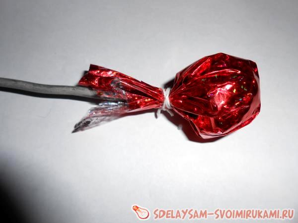 Берём небольшой прямоугольный кусочек красной обёрточной бумаги, и заворачиваем в него конфету.