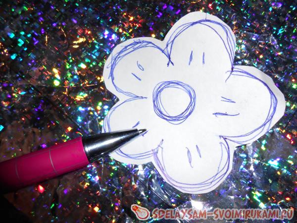На белой бумаге рисуем шаблон цветка, например, пятилистного. Далее вырезаем его и обводим на бумаге серебристого цвета. Цветов можно сделать как можно больше, начиная от пяти штук.