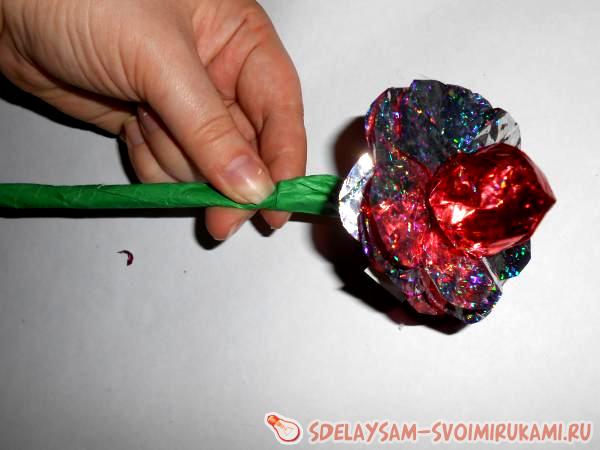 Оборачиваем этой бумагой проволоку. Чтобы бумага не развернулась, слегка подклеиваем клеем вдоль по стеблю цветка.