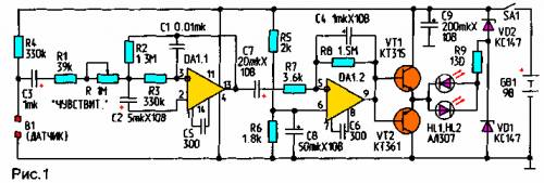В основе этого многофункционального прибора (рис.1) лежит усилитель инфранизких частот с полосой пропускания 0,1...2 Гц и коэффициентом усиления по напряжению 400...1200. В зависимости от типа датчика и выходного устройства прибор можно использовать для многих целей при регистрации сверхнизкочастотных процессов. Особый интерес представляет использование его в качестве так называемого "детектора лжи".