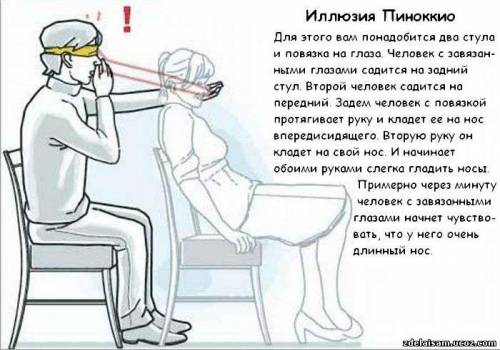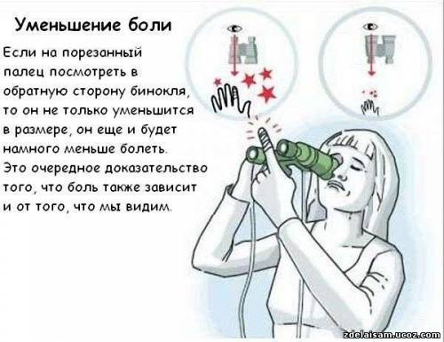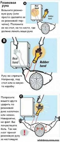 Как можно обмануть мозг. 12 май 2010 Розыгрыши и приколы 68 454 2 (НАЖМИТЕ ДЛЯ УВЕЛИЧЕНИЯ) Вернуться назад 80 1 2 3 4 5 Похожие мастер-классы Подарочный бант Из старого TV Роза из салфетки Газировка в домашних условиях Арбалет для офисной охоты ЗАБАВНАЯ САМОДЕЛЬНАЯ USB-ФЛЭШКА Особо интересное Светильники своими руками Льющиеся цветы из кружки Беспроводной светодиод Как проткнуть гвоздём стеклянную бутылку? Книга - тайник Невидимые чернила Прокомментировать Вопрос: 5+два= Отправить Комментарии (2) #1 StepWay Гости 14 ноября 2010 19:29 0 Мясо!! Ответить #2 Angelinka Гости 7 августа 2017 12:08 0 Что-то меня пугают такие эксперименты, особенно первый с галлюцинациями и с резиновой рукой, не стала бы рисковать так с организмом. А вот для уменьшения боли можно попробовать, жаль, что не на все части тела можно посмотреть через бинокль. Ответить