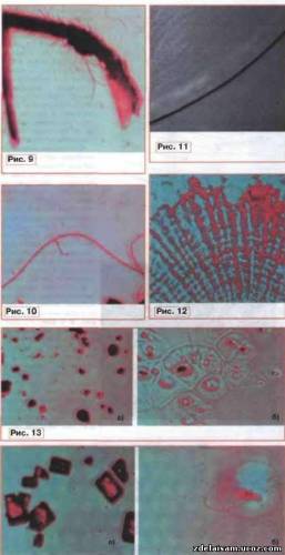 В качестве примеров биологических объектов выбраны паучок, его лапка и усы; они показаны на рис. 9 и рис. 10 соответственно (диаметр уса составляет около 40 мкм), волос автора (диаметр — 80 мкм) — на рис. 11, чешуя рыбы — на рис. 12. Интересно наблюдать процессы растворения веществ в воде. В качестве примера приведены процессы растворения соли и сахара. На рис. 13,а и рис. 14,а показаны частицы сухой соли и кристаллы сахара соответственно, а на рис. 13,6 и рис. 14,6 — процесс их растворения в воде. Хорошо видны зоны повышенной концентрации веществ и эффекты фокусировки света в центрах растворения.