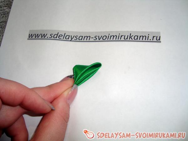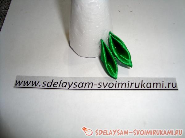 Далее, припалите низ изделия огнем от зажигалки, при этом лепесток нужно зажать пинцетам. Создайте одинаковые зеленые листья. Когда заготовки зеленых веток созданы, принимайтесь за оклеивание елочки. Начинайте приклеивать «ветки» от низа конуса. Сначала наклейте первый ярус по нижнему ободку заготовки, располагайте листья острой частью от елки.