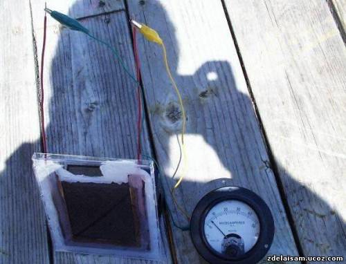На фотографии выше готовая солнечная батарея В ТЕНИ,амперметр показывает приблизительно 6 милиампер.Но даже в темноте эта батарея будет давать несколько милиампер))