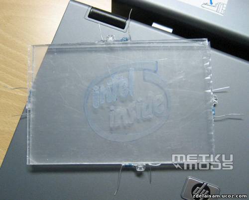 Все слои собраны. Первым идет «Intel», затем «Inside». Лист с овалом идет последним. Включение подсветки происходит в том же порядке. В используемом дизайне последовательность не играет важной роли, так как нет перекрывающих линий гравировки.