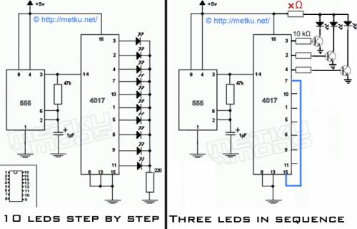 Ранее для организации поочередного включения светодиодов энтузиаст использовал схему, изображенную слева. Скорость переключения светодиодов регулируется микросхемой 555. К тому же если заменить резистор 47 кОм на потенциометр, то можно будет вручную менять частоту включений.