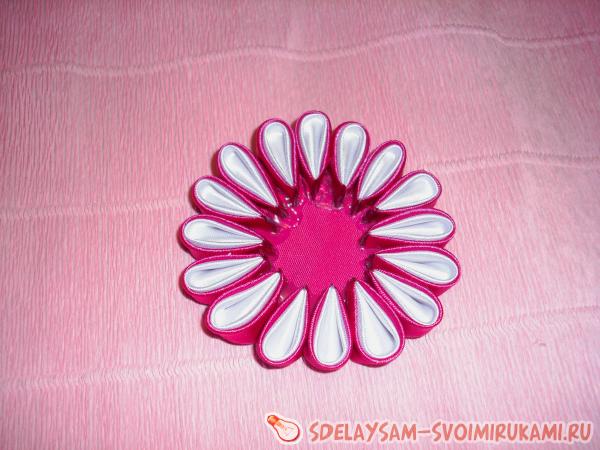 Теперь на основание необходимо приклеить лепестки созданные из двух оттенков лент, раскладывая их по краю окружности.