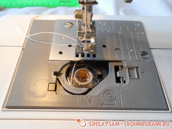 Нитку-резинку в данном случае используем в качестве «нижней» нити машинной строчки. Поэтому заматываем ее на шпульку. Можно вручную, а можно использовать для этого специальный механизм машинки. Это не принципиально. А после шпульку вставляем на место, а нитку-резинку вытягиваем, как обычную нитку при заправке.
