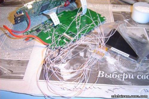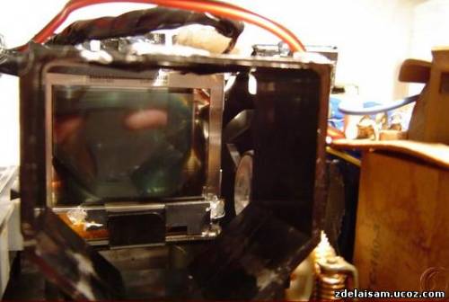 Внимание : в качестве матрицы формирующей изображение можно взять не только маленький телевизор как в статье - подойдет также мр3 плеер воспроизводящий видео, сотовый телефон, а особенно ipod у него хорошее разрешение. Вообщем путей к успеху много. Да и шлейф перепаивать не обязательно.