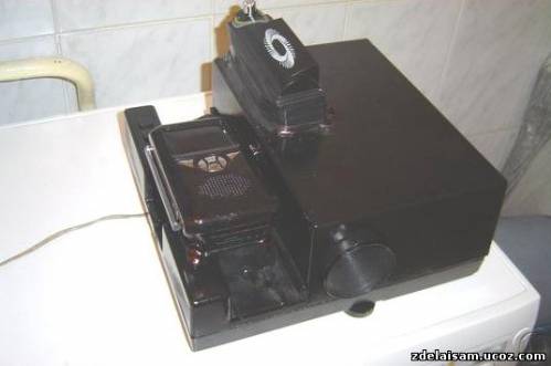 Родной вентилятор выкинул, поставил диаметральную турбинку. Спрятал блоки питания телика и вентиляторов в корпус. Аппарат шуметь перестал и приобрел вот такой облик: