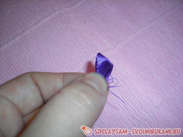 Отложенные в сторону веточки их фиолетовой ленты нужно вернуть в работу. Каждую веточку необходимо вложить в середину заготовки из сиреневой ленты.
