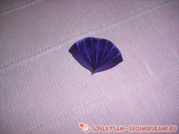 После этого к подготовленному основанию необходимо приклеить веера из фиолетовой ленты. Располагать веерки следует между лепестками.
