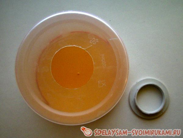 1.Используя нож или же ножницы, прорежьте отверстие в донышке ведерка, ориентируясь при этом на размеры патрона светильника;