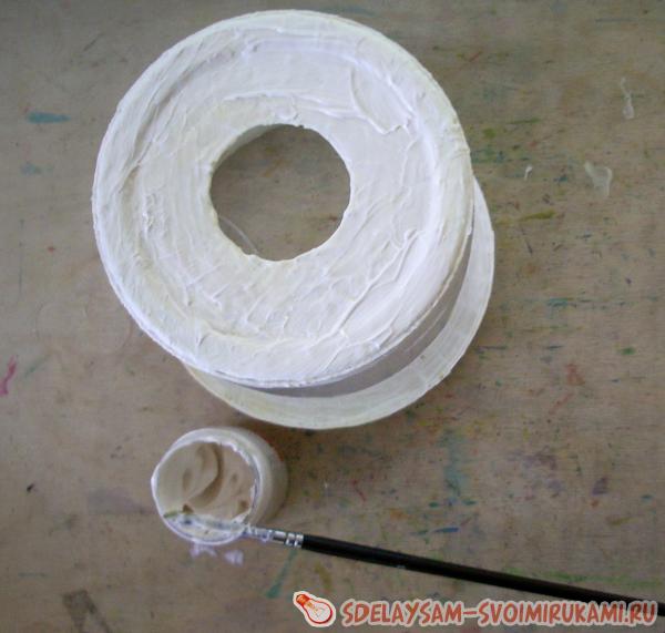 2.Акриловую белую краску нанесите кистью на донышко ведерка и дождитесь ее высыхания. Как правило, краска полностью высыхает очень быстро (приблизительно за 1-2 часа);