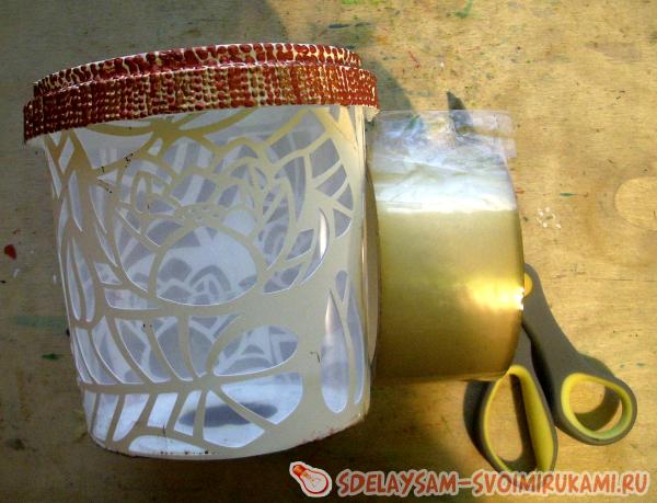 7.Оберните трафарет вокруг ведерка и закрепите его маленькими кусочками скотча;