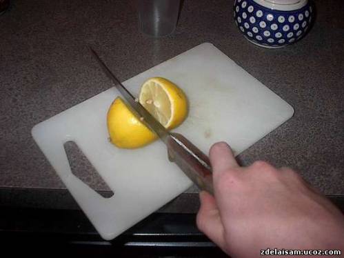 Аккуратно разрезаем лимон пополам и выдавливаем сок в стакон.