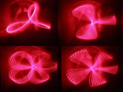 Вещь очень просто устроена и всё видно из прилагаемого рисунка. Зеркальца (размером меньше сантиметра) в всё прочее крепится к гнутой палочке от конструктора на пластилине, жвачке, клею... Батареек хватает на несколько часов. Важно - угол между валами моторов - близок к 90 градусам, зеркальца на валах - криво на 3-5-15 градусов. Результат: на стене или потолке рисуется класическая «фигура Лиссажу» (эпи-/гипо-циклоида), с некоторым количеством лепестков, она всё время крутится, а количество петель зависит от неодинаковости моторчиков, и по мере разряда батарей меняется. Для детей и тех, кто не видал осцилографа - «ух как здорово!» Собирается за полчаса. Для "продвинутых": батарейки можно ведь и одни и те же - не забудте только, что указке надо 4.5 вольта, а моторчикам - какие достанете... Для "совсем продвинутых" - указка потребляет ~40 миллиампер, и чем вы ей их обеспечите - ваше дело (просто приходится последовательно-паралельно включать указку и два мотора) от внешнего 5v источника. Не забудьте поместить устройство в солидный корпус и говорить что купили за $300:)) Вот фотографии (с разными выдержками) работы этого лазерного светового эффекта.