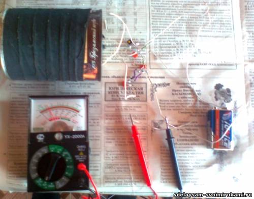 Дайте схеме "прогреться" несколько минут после подачи напряжения питания, после чего показания амперметра должны снизиться до весьма малых значений. Если показания амперметра отрицательные, переключите провод датчика к базе другого транзистора и поменяйте полярность подключения амперметра. Если на резисторах сопротивлением 2,2 кОм падает заметное напряжение, может быть до одного вольта, попробуйте очистить все растворителем и полностью высушить. Когда показания амперметра станут низкими и стабильными, поднесите радиоактивный источник, например, калильную сетку , к окошку, закрытому фольгой, и показания должны быстро возрасти. В качестве измерительного прибора можно применить цифровой вольтметр со шкалой до 1 В или амперметр со шкалой 100 мкА. Показанный ниже измерительный прибор уже имеет шкалу, отградуированную в единицах радиоактивности, и показания около 2,2 обусловлены воздействием калильной сетки .