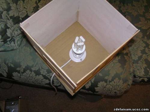 Оно должно быть выпилино точно под размер стенок. Для начало крепим патрон для нашего светильника. Далее на углах дна приклеиваем вертикальные реечки для крепкости стенок.