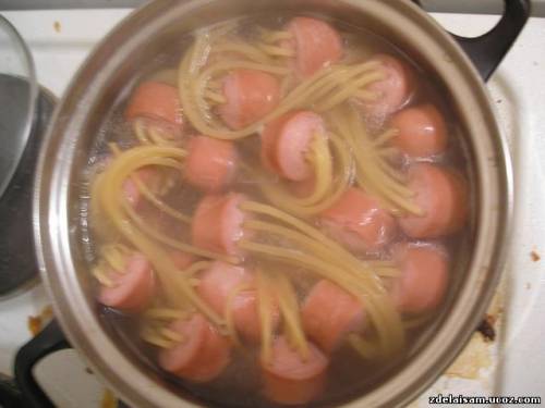 Через некоторое время спагетти обмякнут и сосиска упадет на дно кастрюли.