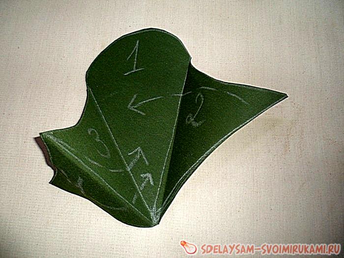 Вырезаем нашу основу и пробуем сложить как показано на рисунке. Получается это так - №2 загибаете на №1, потом №3 на №2, и №4 отгибаете на №3. Брезент хорошо гнётся и запоминает складки, поэтому с ним удобно работать, да и форму держит отлично, как раз для ножниц подходит, и ножницы цепляться острыми концами за такую ткань не будут.