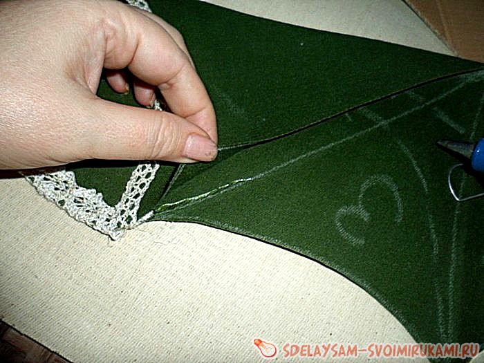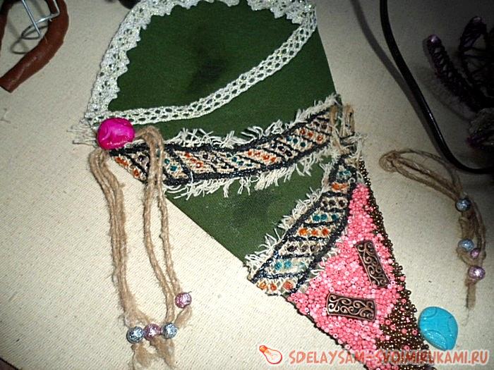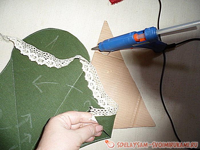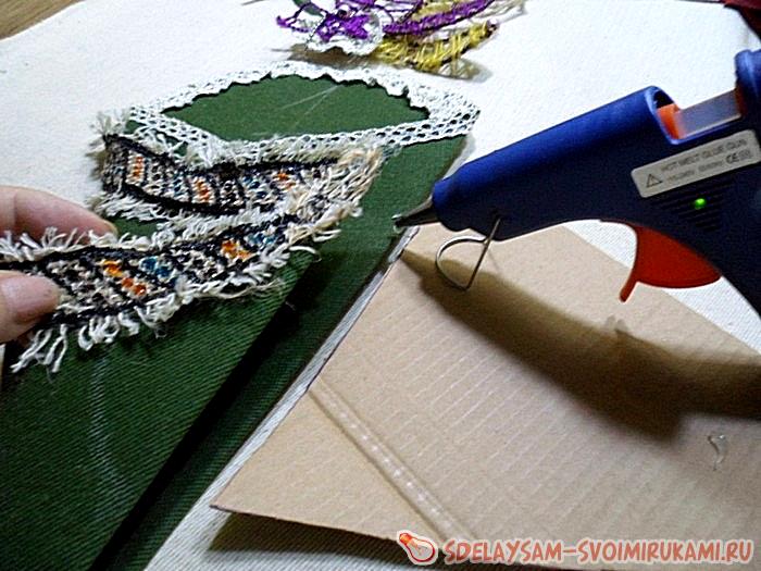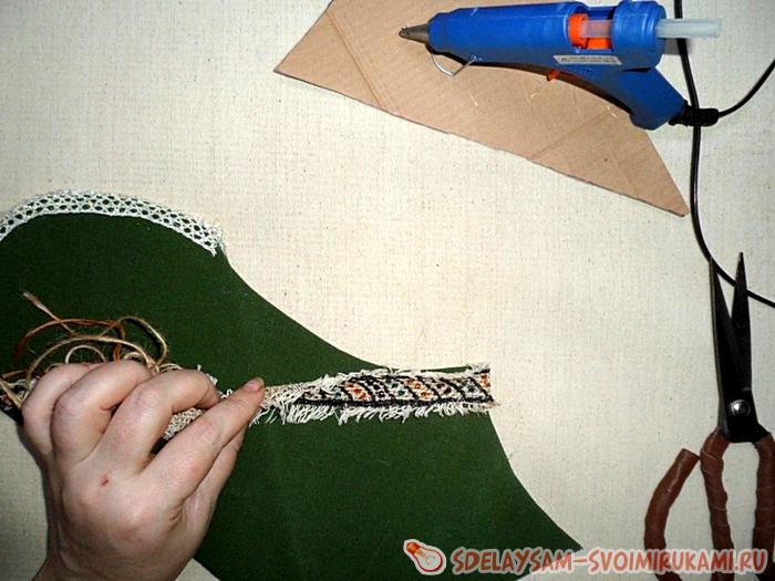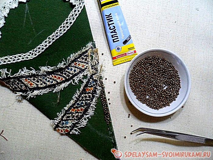 Теперь остаётся включить термо-пистолет для приклеивания тесьмы и украшений, и приготовить ещё один какой нибудь крепкий клей для наклеивания мелких бусин. Начинаем обклеивать тесьмой или кружевом верхние части будущих кармашков. Так же не забываем приклеивать боковые створки.
