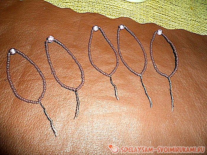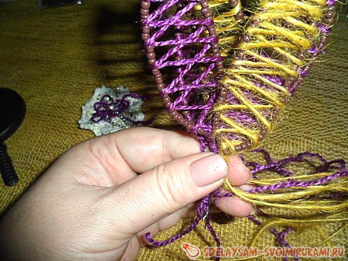 А пока бусинки будут приклеиваться, можете сделать ещё какие-нибудь дополнительные украшения, например такие, как эти: на жестковатую проволочку нанизывается любой бисер, и затем обматывается толстыми нитками или верёвочками крест на крест. Можно ещё добавить простой цветочек из кружева и любую фурнитуру.