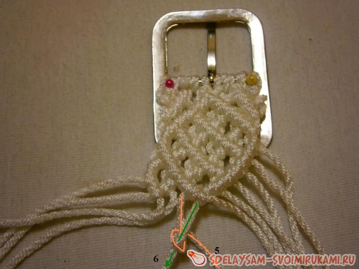 15. Теперь приступим к плетению рядов ремня. Как видно, получилось по 6 нитей слева и справа. Возьмём 2-ю нить и оттянем наверх. Набросим на неё узел фриволите 1-й нитью.