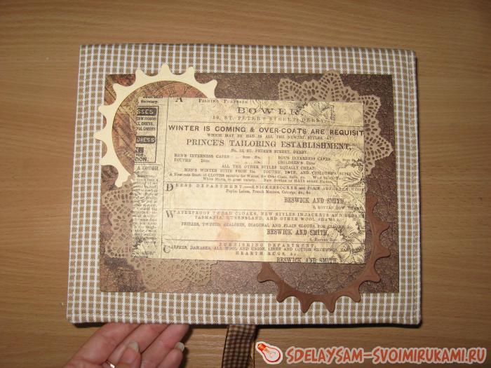 Прошиваем обложку по краю всей заготовки. Теперь складываем обложку и примеряем оформление наверх коробки. Нам нужно два прямоугольника из скрапбумаги и часть вырубки.