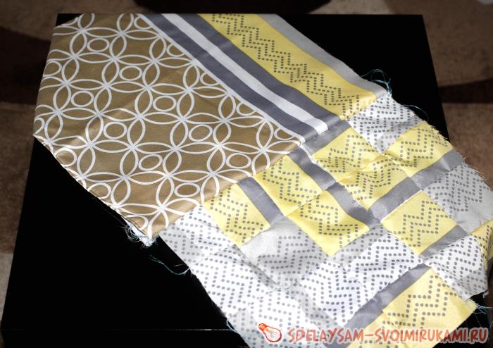 8. На фото изображена тыльная сторона изделия. Третий и дополняющий прямоугольный отрез ткани расположен внизу, он является формирующим при сборке наволочки. Теперь и тыльная и лицевая стороны подушки одинаковых размеров.