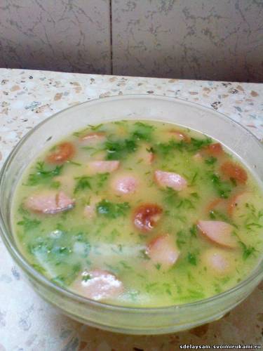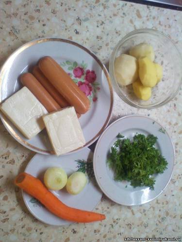 1) сосиски 4 штуки и 2-а сырка. Вариантов замены море, как лучших так и худших. Сосиски можно без потерь заменить колбасой. Сырки лучше брать по-нежней, по-мягче. Самый наилучший вариант взять плавленый сыр в ванночках - он более нежный. Хотите суп погуще - берите по больше сыра.