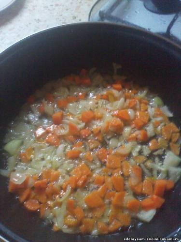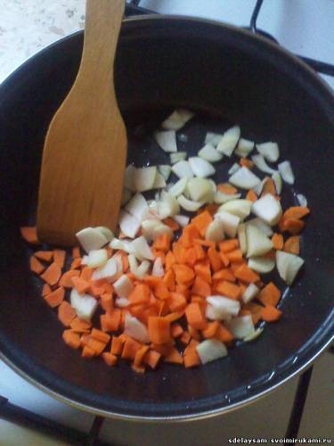 Мелко нарежем или натрём морковку с луком и чуть-чуть обжарим.