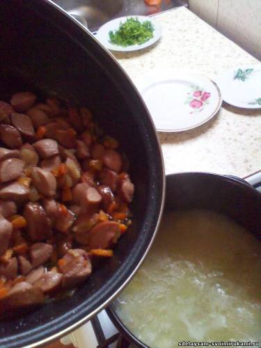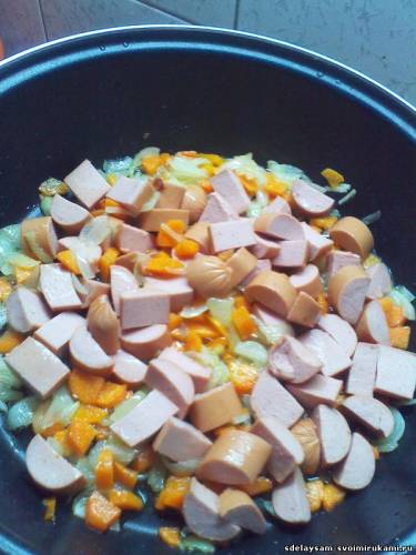 Добавим туда нарезанные сосиски и продолжим обжаривать всё вместе до золотистого оттенка. Убираем пока в сторону.
