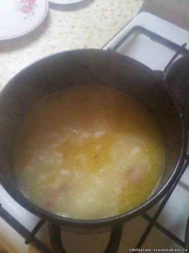 Вода закипела - кидаем картошку, если сыр не очень мягкий, то кидаем его вместе с картошкой. Если сыр мягкий, то после 2-3 минут варки картошки. Всё помешиваем, сыр растворяется, картофель готовится.