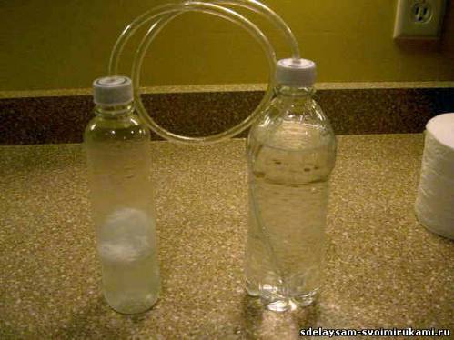 Как видно из рисунка две бутылки надежно соединенные трубкой. Обратите внимание, что во второй бутылке куда будет наливаться наша газируемая жидкость трубка идет до самого дна, а в первой где будет идти реакция - трубка чуть выглядывает из под крышки.