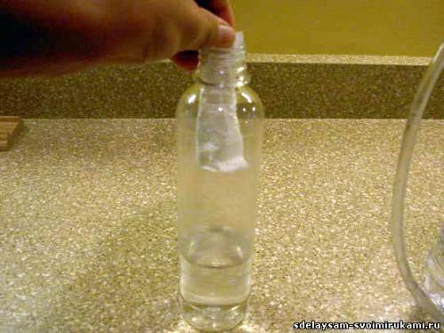 Нам понадобится: уксус, сода, пару пластиковых бутылок, трубка, кусочек салфетки или туалетной бумаги.