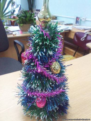 4) Берем мишуру зеленого цвета (длиной около метра), верхний конец мишуры зажимаем верхней скрепкой и обматываем каркас елки с верху в низ. Другой конец гирлянды закрепляем внизу другой скрепкой.