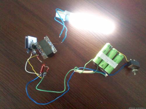Лично я купил в магазине лампу на 11 Ватт. Разобрал ее схему запуска (иначе работать не будет !) и запитал свой собранный преобразователь от 6 - ти вольтового аккумулятора. Смотрите фото: