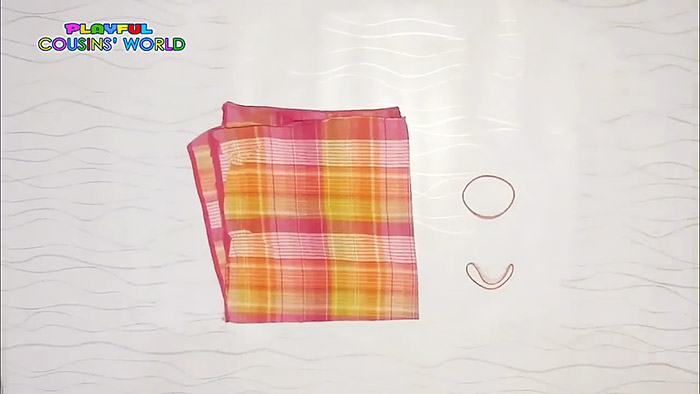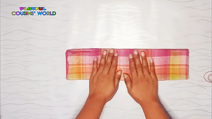 Визуально делим получившийся прямоугольник на 3 части. С одной стороны продеваем канцелярскую резинку и загибаем одну треть платка на его середину.
