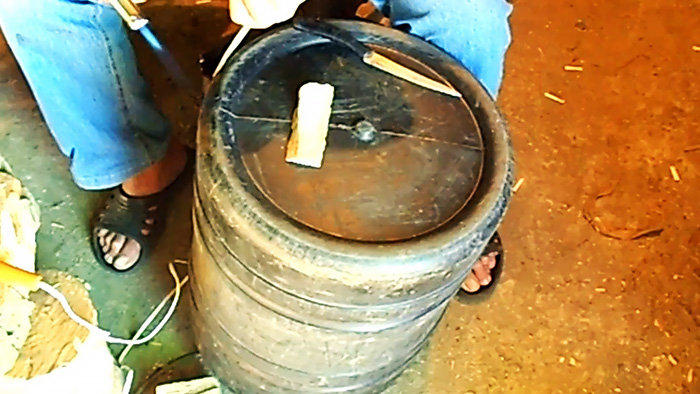 Далее берем газовую горелку и постепенно вплавляем сетку в тело бочки.